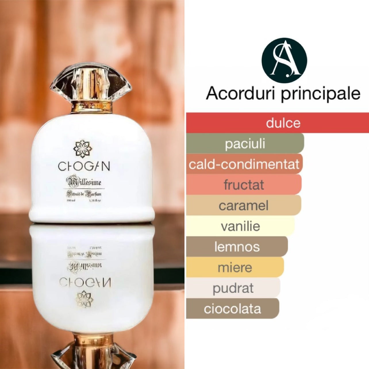 Această esență te cucerește printr-un amestec voluptuos de fructe exotice, caramel și vanilie, echilibrate de accente lemnoase și orientale. Făcând parte din eleganta colecție Chogan Olfazeta pentru femei, acest parfum emană căldură, magnetism și rafinament, lăsând o amprentă olfactivă memorabilă ce persistă ore întregi.