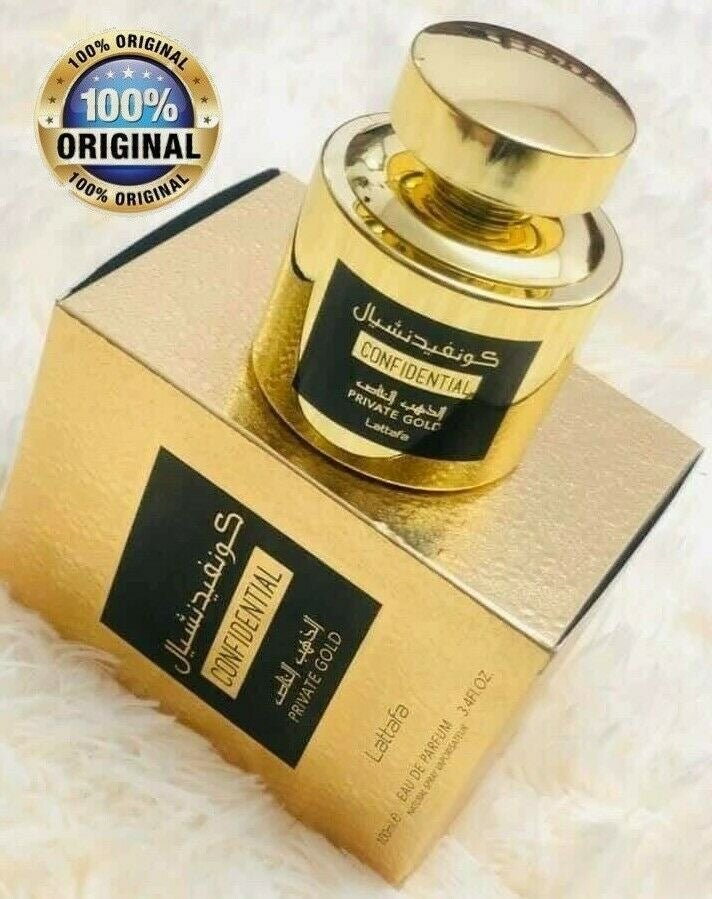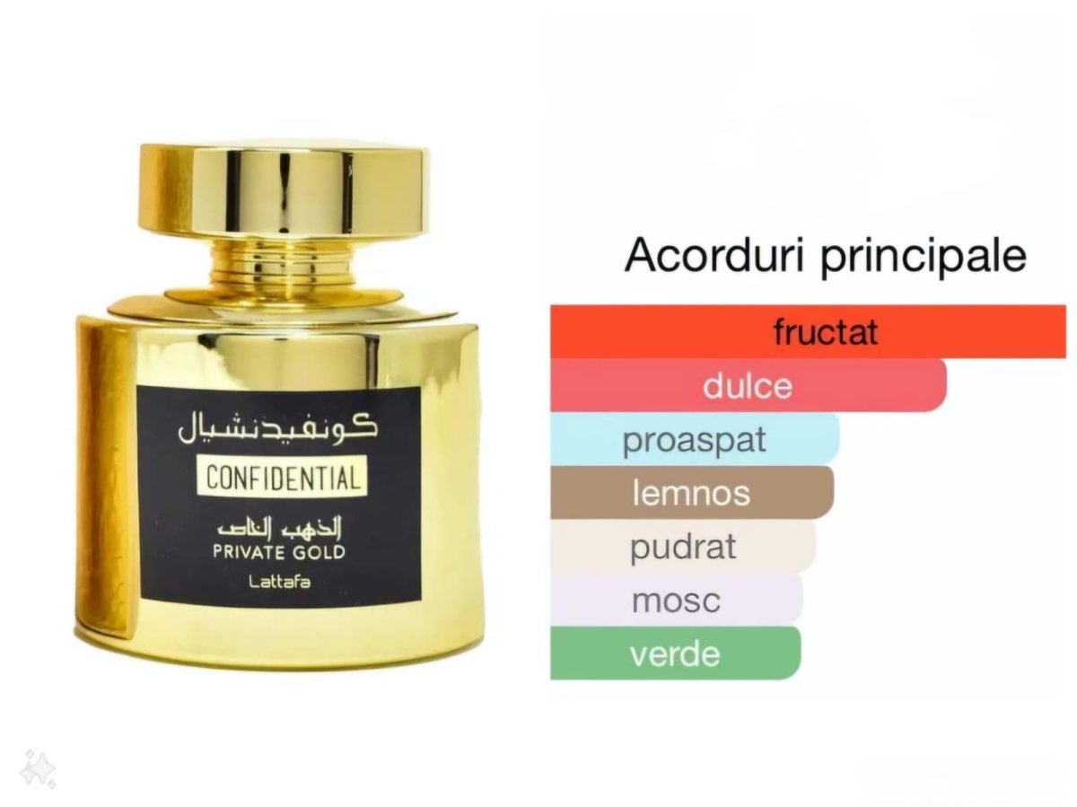 Lattafa Confidential Private Gold este un parfum arabesc de damă floral-fructat persistent, o esență elegantă și rafinată ce exprimă luxul oriental autentic și feminitatea modernă.