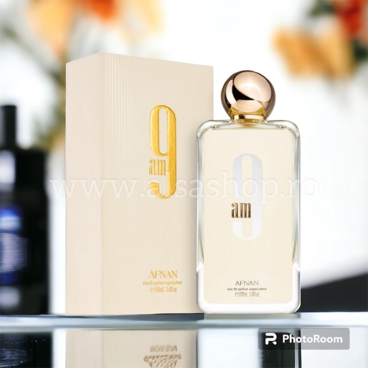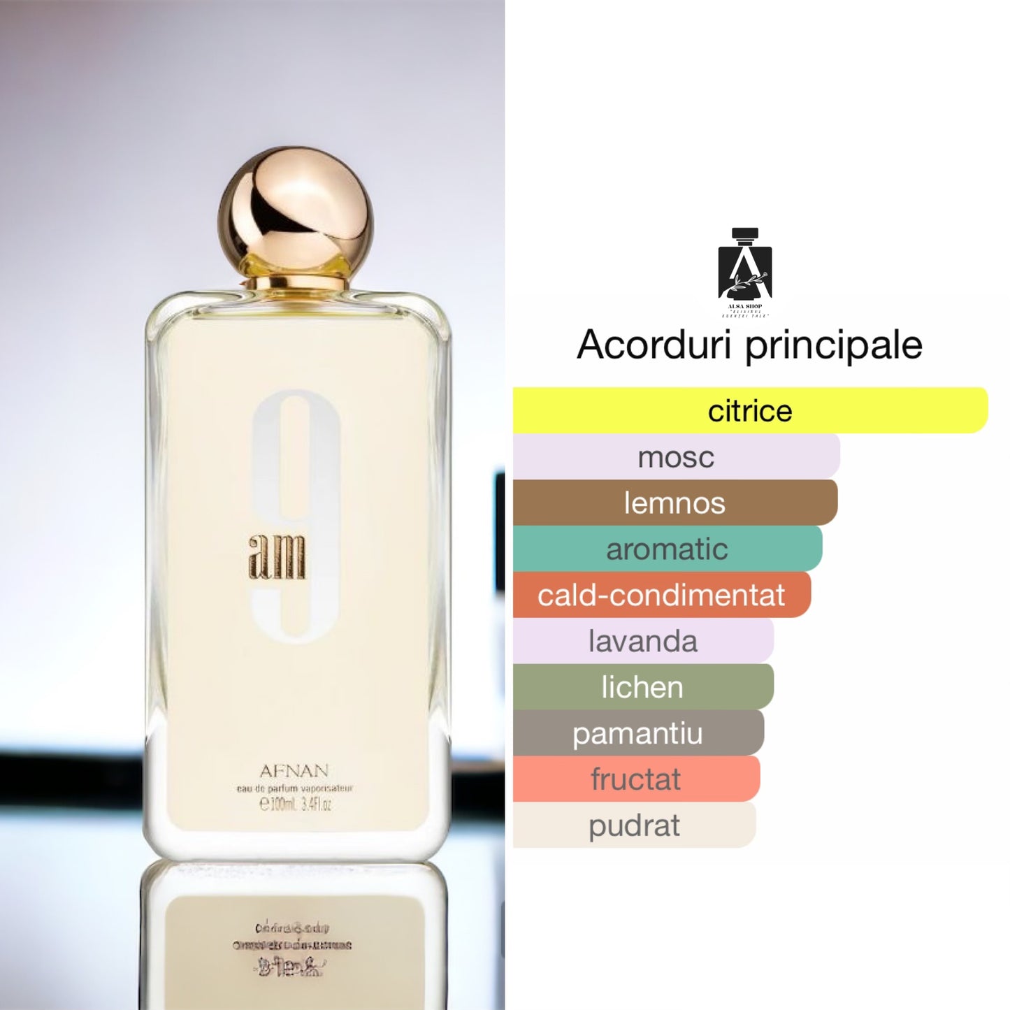 Afnan 9AM impresionează prin echilibrul său subtil între luminozitatea citricelor și profunzimea lemnului de cedru. Este un parfum modern, elegant și revigorant, ce exprimă încrederea, feminitatea și rafinamentul fiecărei femei.